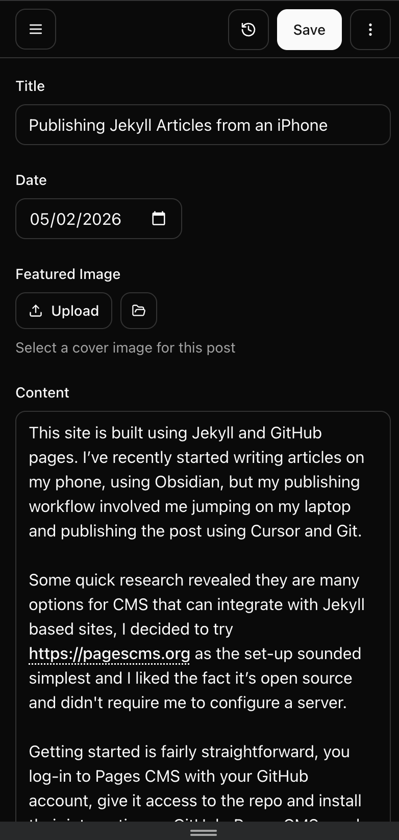 This site is built using Jekyll and GitHub pages. I’ve recently started writing articles on my phone, using Obsidian, but my publishing workflow involved me jumping on my laptop and publishing the post using Cursor and Git.